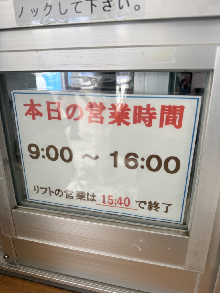 当日掲示は9:00〜16:00で、リフトは15:40で終了。逆算して動けたので、子連れの時間管理がラクでした。