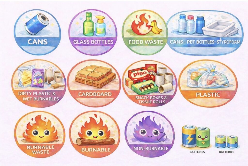 - Daily trash (burnable / food waste) and recyclables are grouped together.