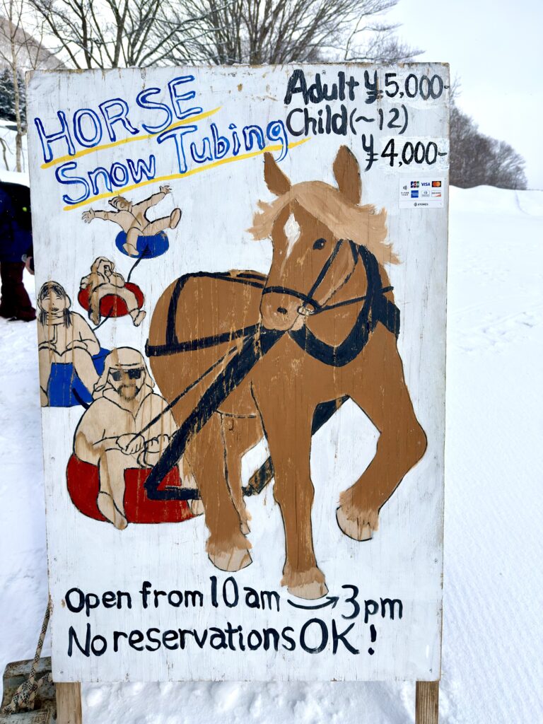 A. On the Hokkaido Lion Adventure winter page for Niseko Village, several winter activities are listed, while the horse-drawn sleigh activity is noted as being provided by another company. Since we also saw an on-site sign using the name Horse Snow Tubing, it is best to check the local information on the day you visit.
