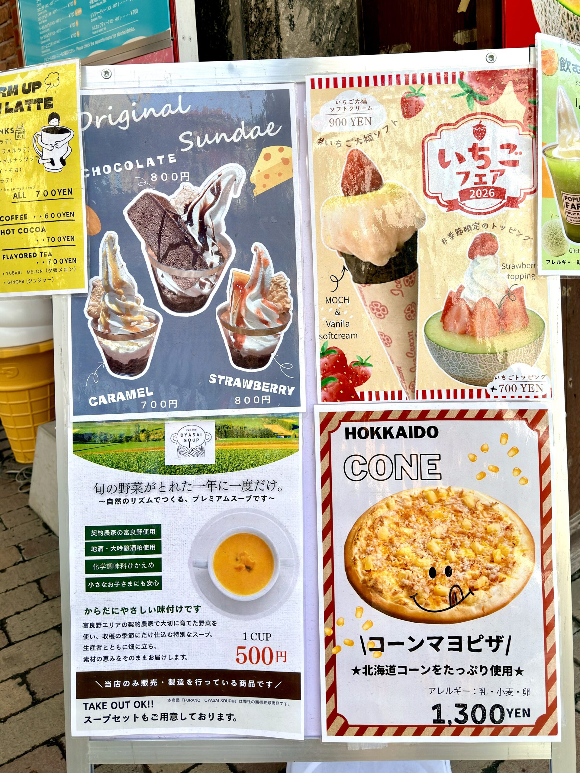 A. ありました。実際にいちごオーレを飲みましたが、お茶もあるようでした。訪問時はアメリカンドッグ440円、クッキーアイス500円、フルーツワッフル1,200円などがあり、観光途中のひと休みにも向いていました。