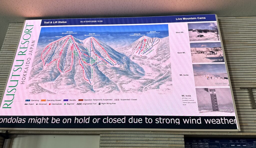 A. 館内の案内表示に「強風でゴンドラが見合わせ・運休になる可能性」が示されていました。滑走予定がある日は、当日の運行状況をこまめにチェックすると安心です。