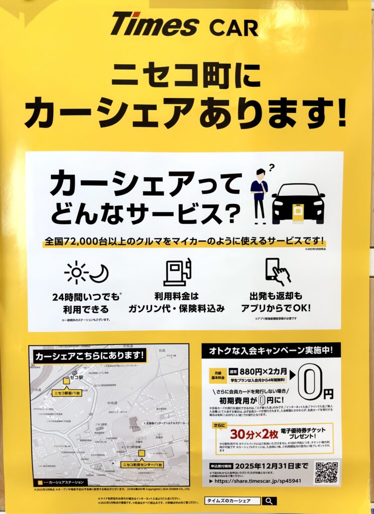 タイムズカー ニセコ 旅行で使うなら、レンタカーを丸1日借りるほどではないけれど、駅・町内・温泉・買い物へ短時間だけ車で動きたい人に向いています。ニセコは徒歩やバスだけだと行ける場所が限られやすいので、15分単位で使えるカーシェアがあると、子連れ旅行や荷物が多い日の移動がかなりラクになります。