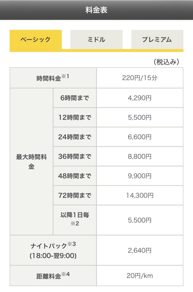 ベーシッククラスの時間料金は15分220円。6時間4,290円、12時間5,500円、24時間6,600円、72時間14,300円の最大時間料金が設定されています。短時間だけ使いたいときは、レンタカーよりも気軽に使いやすい料金体系です。