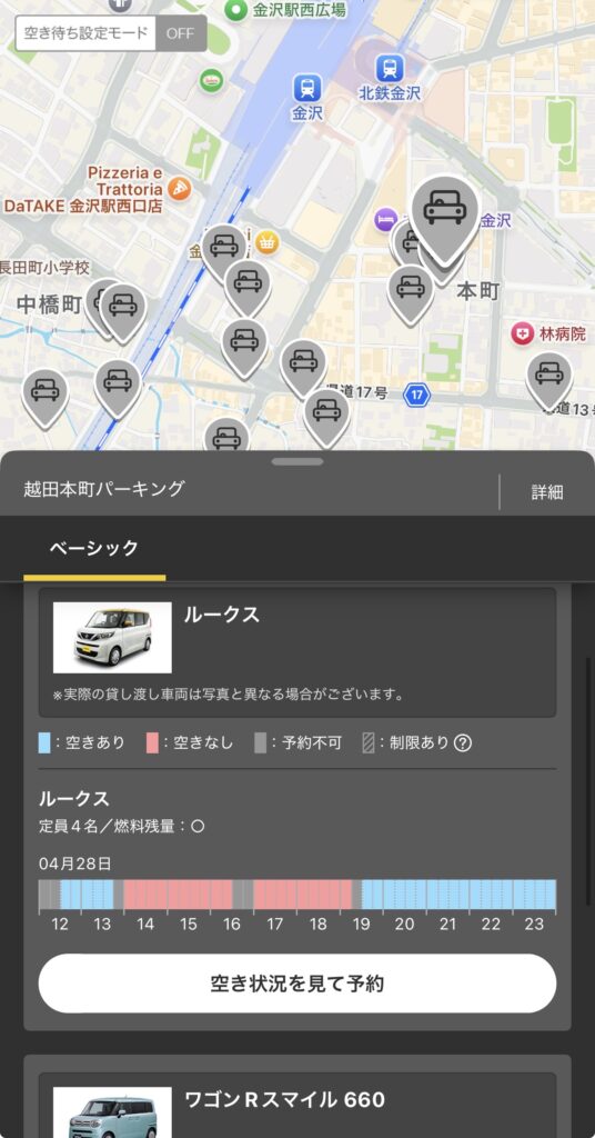 どちらも1台ずつのため、使いたい時間に必ず空いているとは限りません。特にスキーシーズン、連休、週末は早めにアプリで空き状況を確認しておくと安心です。車種・台数は変更される可能性があるため、利用前に公式アプリで最新情報を確認してください。
